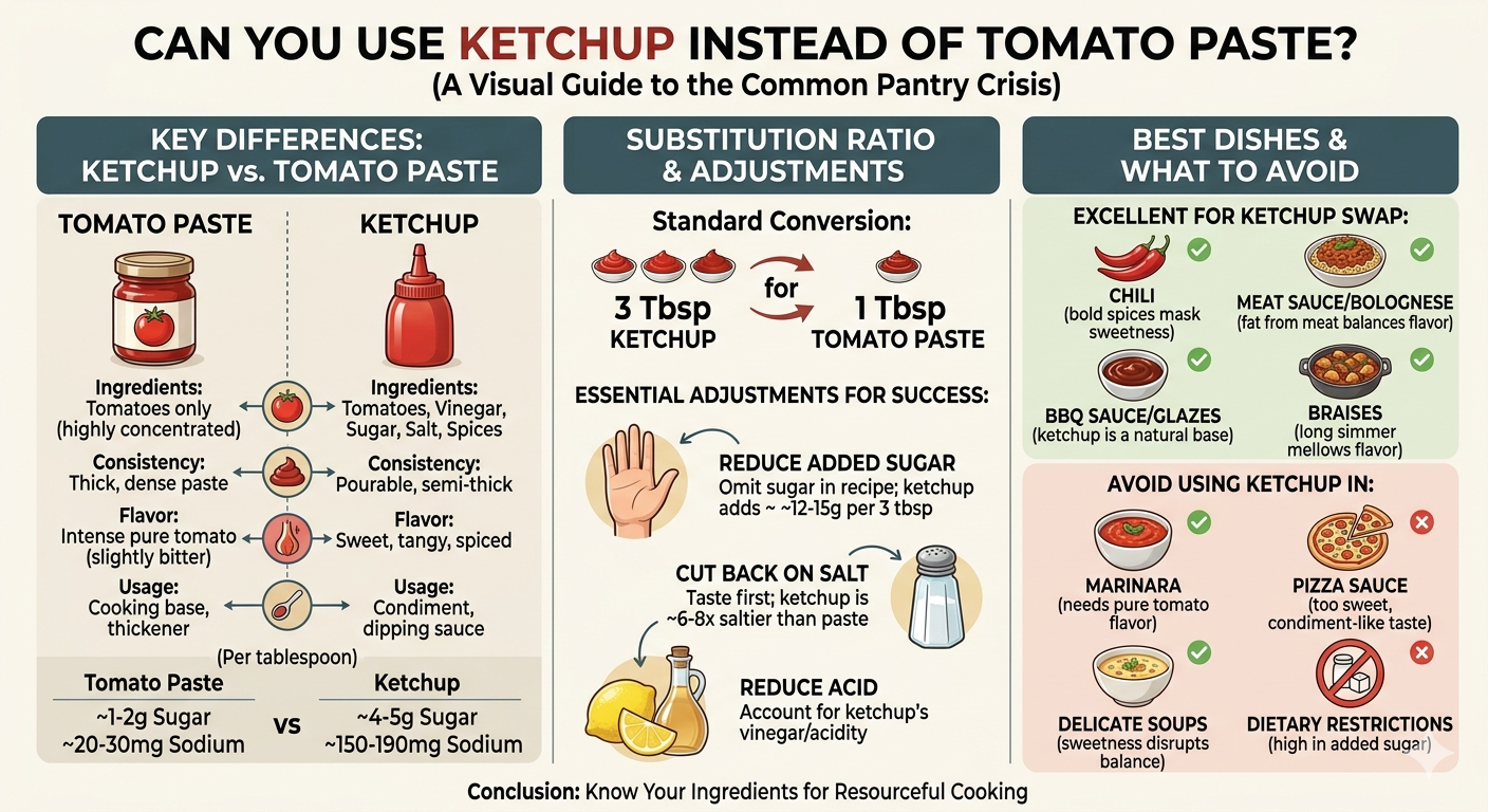 Kehabisan pes tomato pertengahan resipi adalah krisis dapur biasa. Anda mengimbas pantri anda dan melihat sebotol sos tomato — soalan segera menjadi: bolehkah ia melakukan kerja? Jawapan ringkasnya ialah ya, dengan kaveat. Sos tomato sebagai pengganti pes tomato boleh digunakan dalam banyak hidangan lazat, tetapi ia bukan pengganti drop-in. Kedua-dua perasa dibuat daripada tomato, tetapi pada asasnya ia adalah produk yang berbeza dengan profil rasa, kandungan gula dan kepekatan yang berbeza.